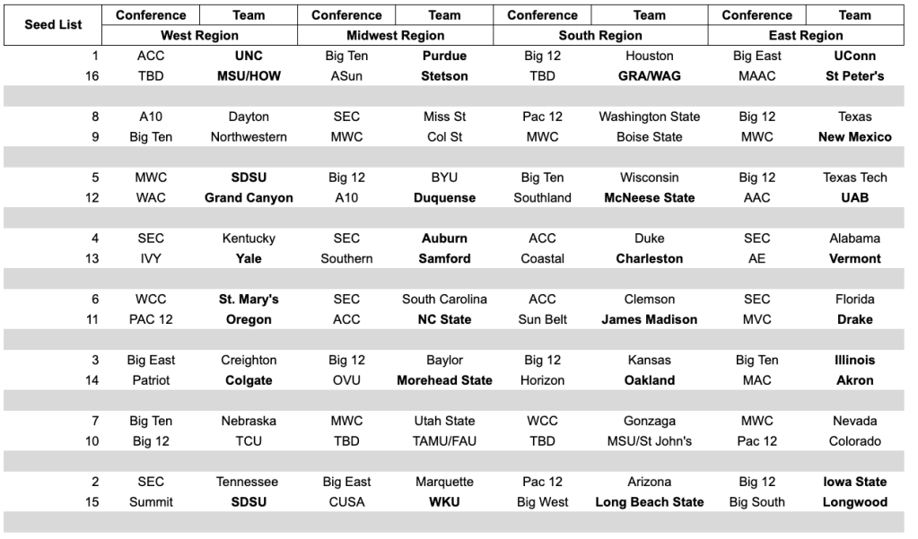 Share this: Click to share on X (Opens in new window) X Click to share on Facebook (Opens in new window) Facebook Like Loading... Related Final 2024 Bracketology March 17, 2024March 17, 2024 / JSB Bracket / Leave a comment